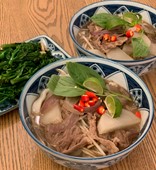 - In the serving bowls, divide and layer the beansprouts, onion and mooli slices, and beef strips over the noodles.